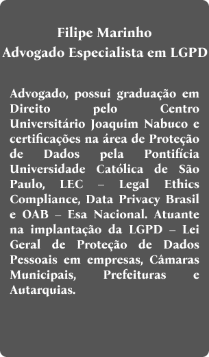 Advogado, possui graduação em Direito pelo Centro Universitário Joaquim Nabuco e certificações na área de Proteção de Dados pela Pontifícia Universidade Católica de São Paulo, LEC – Legal Ethics Compliance, Data Privacy Brasil e OAB – Esa Nacional. Atuante na implantação da LGPD – Lei Geral de Proteção de Dados Pessoais em empresas, Câmaras Municipais, Prefeituras e Autarquias.