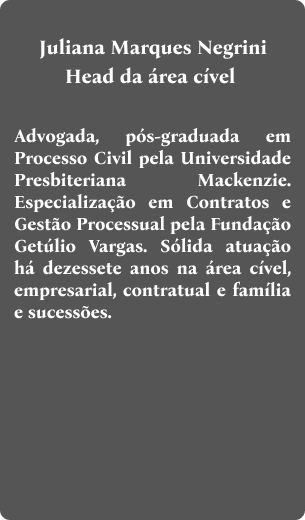 Advogada, pós-graduada em Processo Civil pela Universidade Presbiteriana Mackenzie. Especialização em Contratos e Gestão Processual pela Fundação Getúlio Vargas. Sólida atuação há dezessete anos na área cível, empresarial, contratual e família e sucessões.