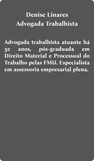 Advogada trabalhista atuante há 30 anos, pós-graduada em Direito Material e Processual do Trabalho pelas FMU. Especialista em assessoria empresarial plena. E-mail: denise@ferreiradearaujo.com.br